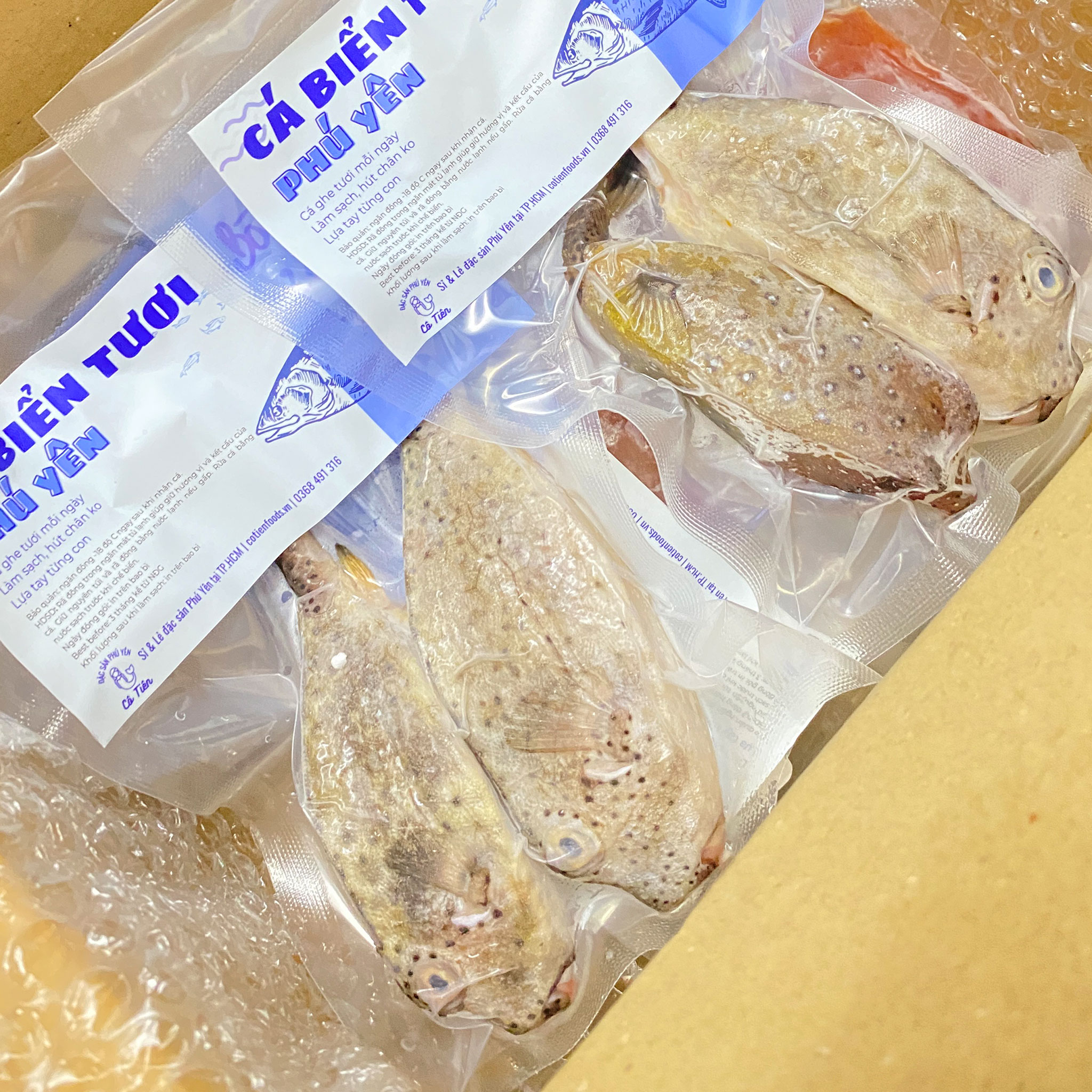 Tại Cô Tiên Foods – Đặc sản Phú Yên, cá bò hòm được ngư dân đánh bắt trực tiếp từ biển, sau đó làm sạch, hút chân không và cấp đông nhanh -18°C, đảm bảo giữ nguyên hương vị tươi ngon.